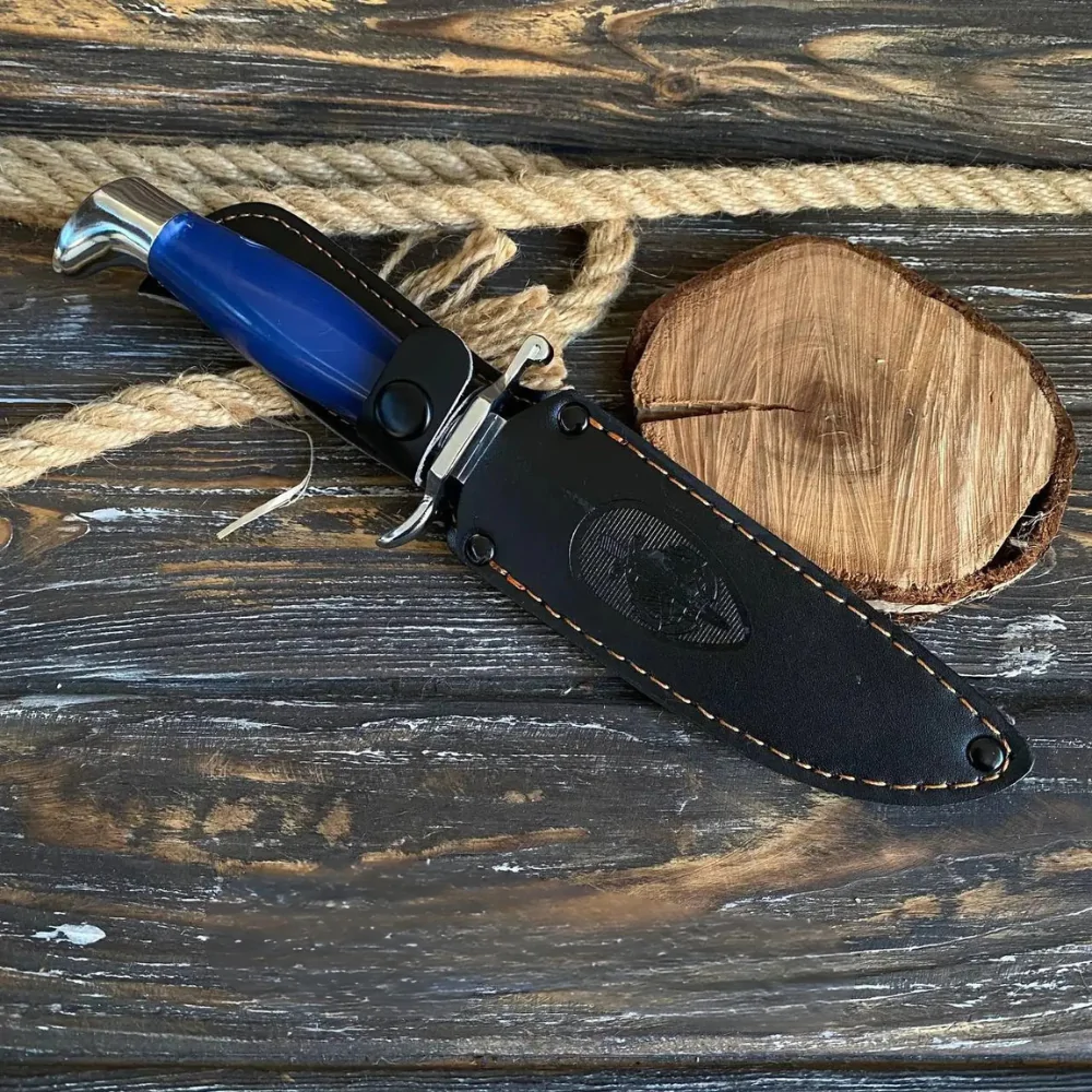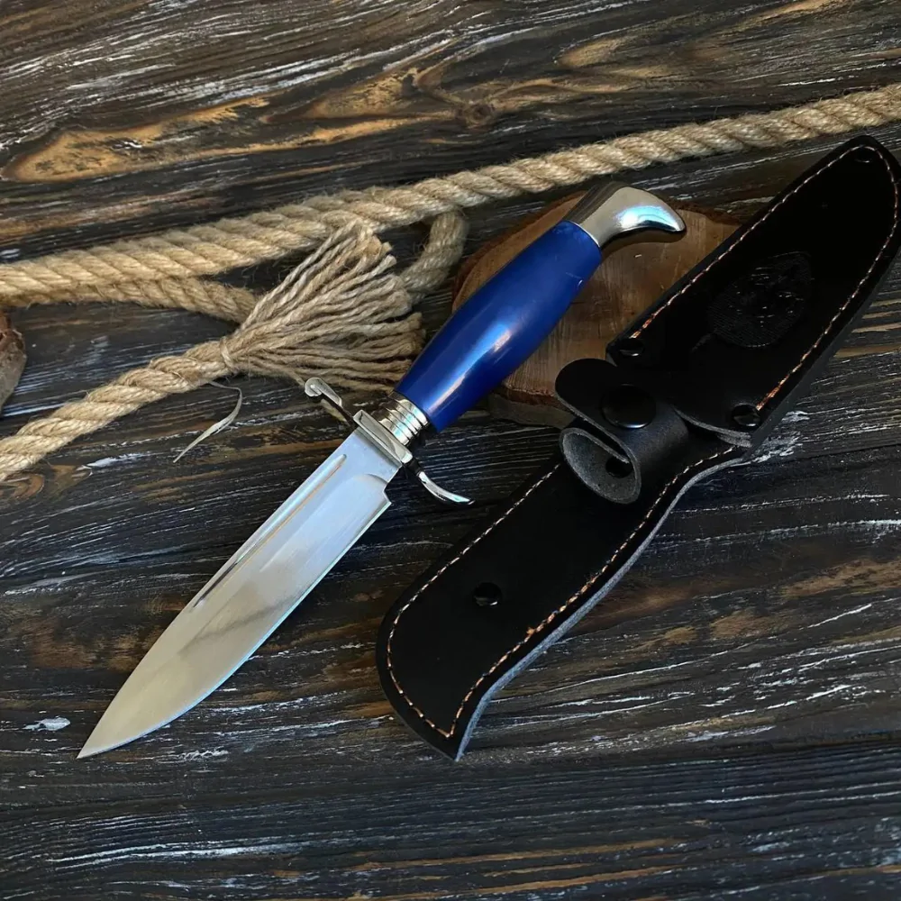 Фінка з синьою рукояттю з акрилу – це класичний ніж, що поєднує дизайн і практичність. Його ретельно продумана форма ідеально підходить для різання та виконання колючих рухів, завдяки чому цей ніж стає універсальним