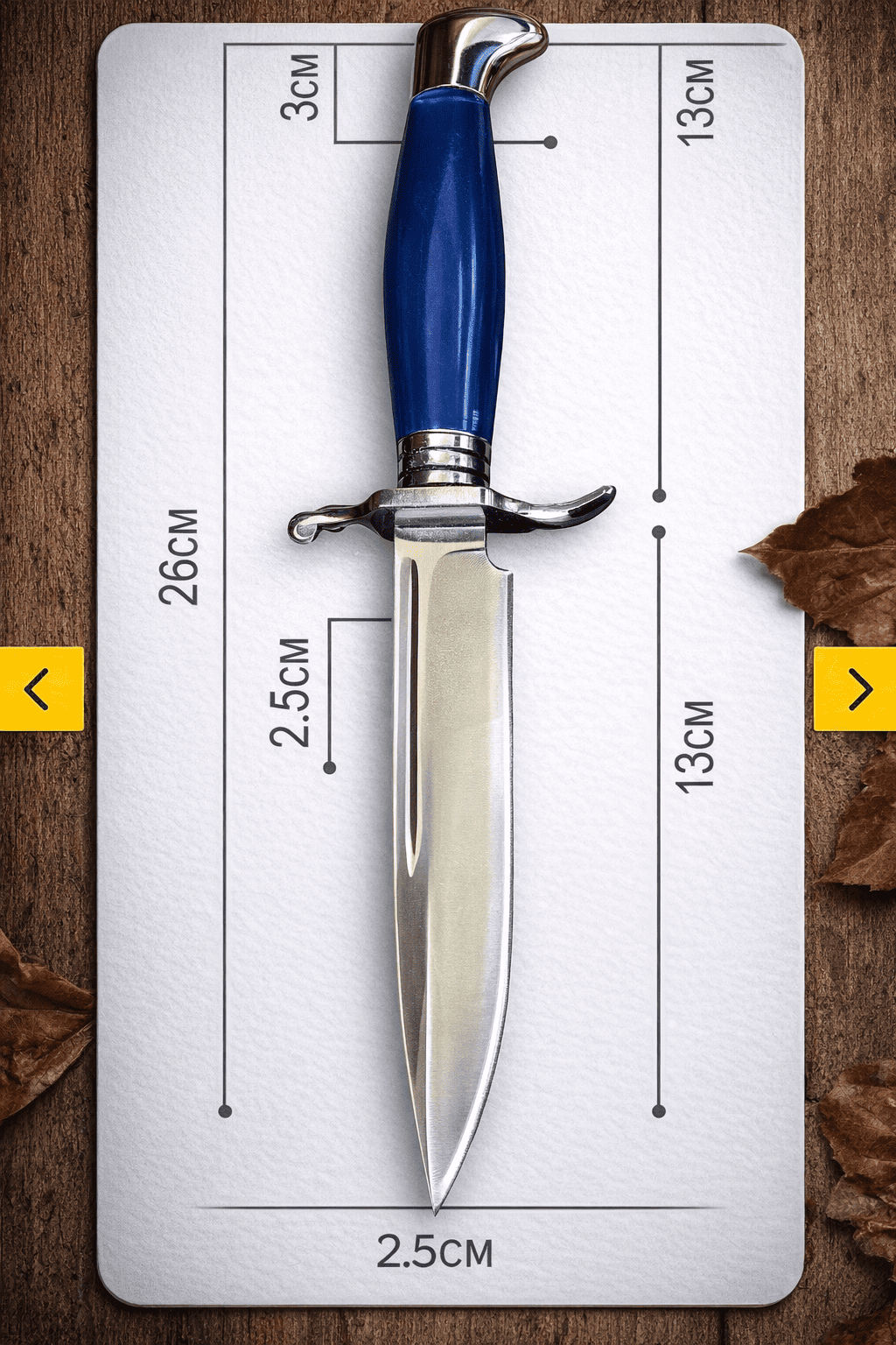 Фінка з синьою рукояттю з акрилу – це класичний ніж, що поєднує дизайн і практичність. Його ретельно продумана форма ідеально підходить для різання та виконання колючих рухів, завдяки чому цей ніж стає універсальним