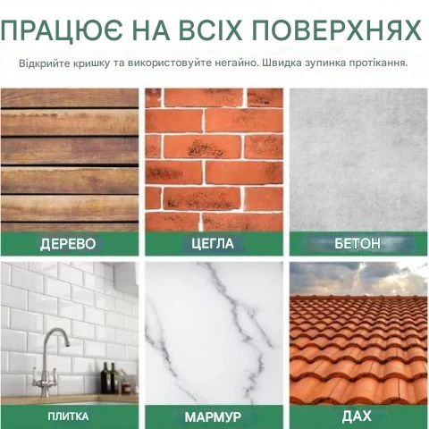 У мене була невелика, але постійна теча біля крана у ванній. Почистила ділянку, нанесла 2 шари та залишила на ніч. Наступного ранку теча припинилася. Минуло 12 днів, а все ще сухо.