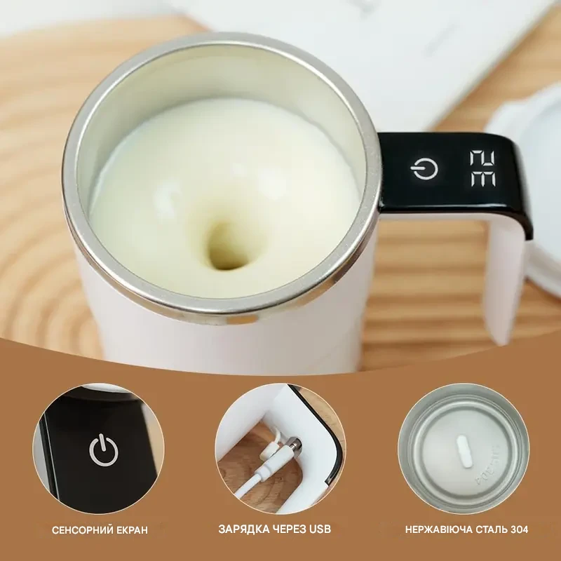 Виготовлена з внутрішньої частини нержавіючої сталі SUS 304 та зовнішньої оболонки з ABS-пластику, ця кружка безпечна та довговічна. Двічі торкніться, щоб почати помішувати різні напої, такі як кава, молоко або протеїнові коктейлі. Підходить як для гарячих, так і для холодних рідин (не рекомендується для прямого заморожування).