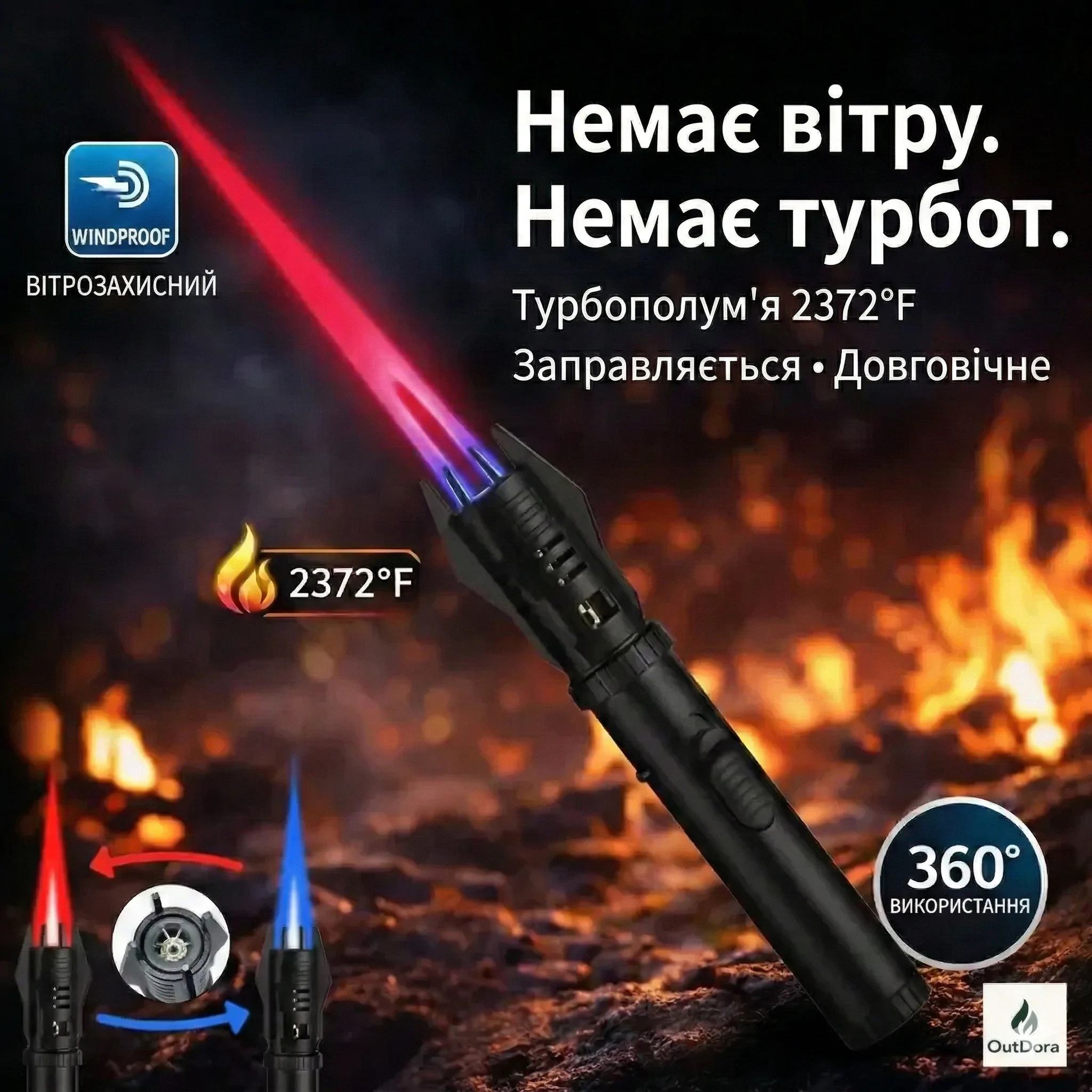 Наша вітрозахисна турбо запальничка забезпечить потужний та стабільний вогонь навіть при сильному вітрі. Забудьте про розчарування та незручності – з OutDora ви завжди будете з вогнем.